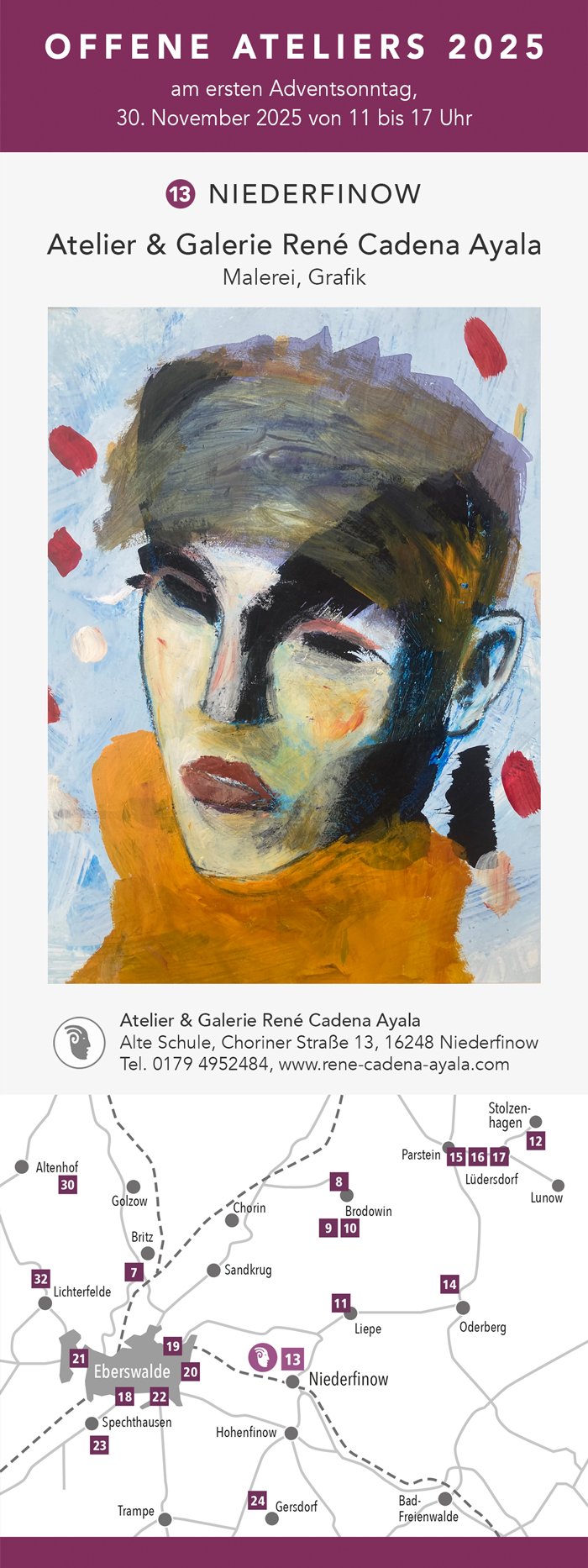 Liebe Kunstinteressierte,Am 1. Advent, Sonntag den 30. November, ist wieder Tag des offenen Ateliers von 11 bis 17 Uhr. Zweimal jährlich öffnen Künstler und Kunsthandwerker im Landkreis Barnim ihre Ateliertüren. Das Atelier von René Cadena Ayala mit seinem Nachlass wird an diesem Tagen ebenfalls zugänglich sein. Gerne möchte ich … Continue readingTage der offenen Ateliers