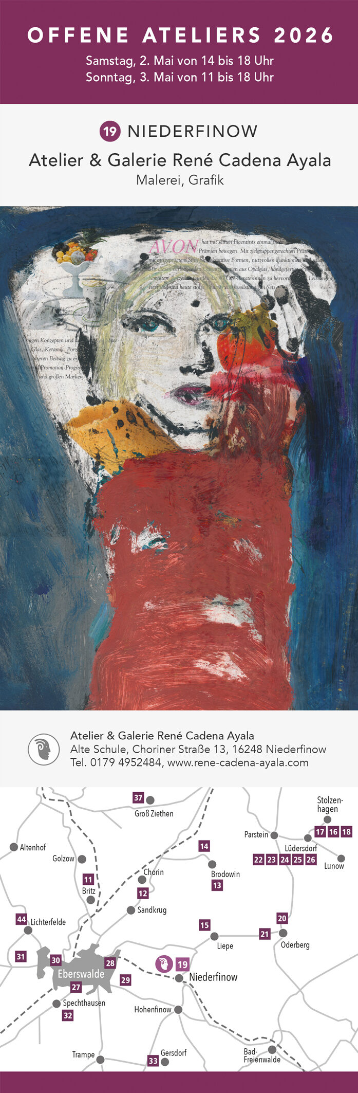 Liebe Kunstinteressierte,Am 1. Advent, Sonntag den 30. November, ist wieder Tag des offenen Ateliers von 11 bis 17 Uhr. Zweimal jährlich öffnen Künstler und Kunsthandwerker im Landkreis Barnim ihre Ateliertüren. Das Atelier von René Cadena Ayala mit seinem Nachlass wird an diesem Tagen ebenfalls zugänglich sein. Gerne möchte ich … Continue readingTage der offenen Ateliers